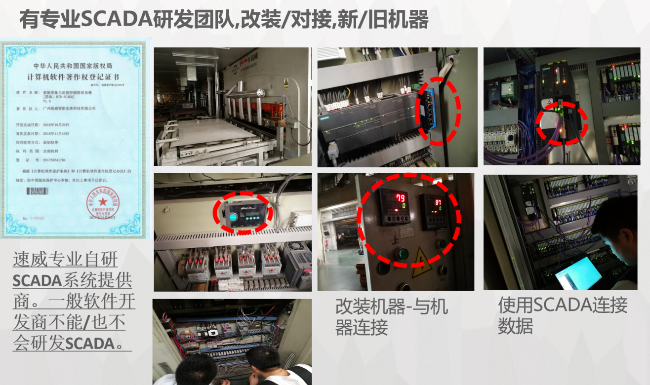 在2016年,我們就成立了SCADA專業(yè)團隊,由電子通信專業(yè)、熟悉機械操作的成員組成,與傳統(tǒng)MES供應(yīng)商的IT、電腦開發(fā)人員不同:該團隊的技術(shù)專業(yè),側(cè)重于現(xiàn)有機器對接、舊有機器改裝。 下圖是我們的SCADA專利認(rèn)證、其他是我司在成功案例中,對機器進行對接與改裝的現(xiàn)場照片。