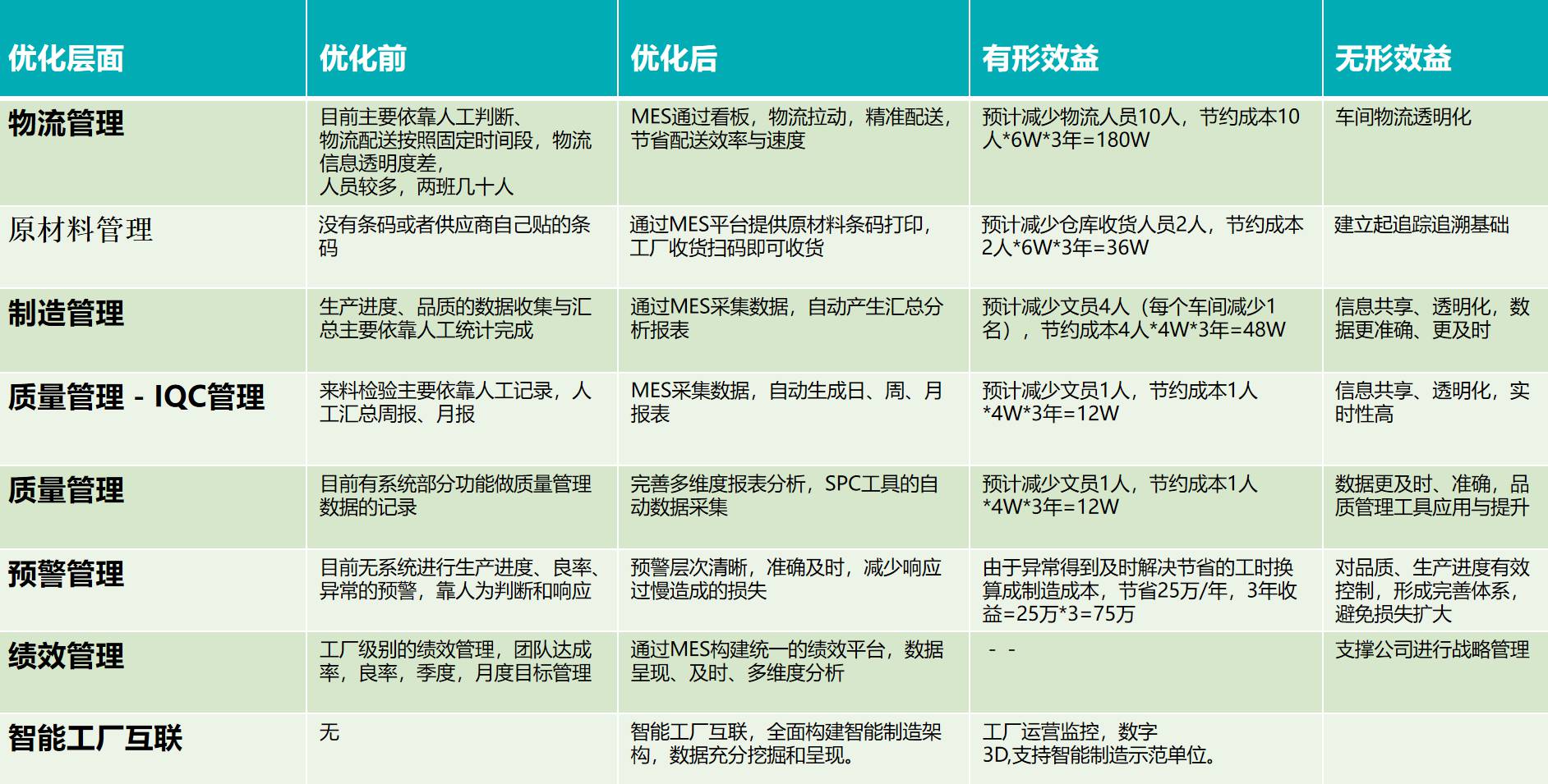項(xiàng)目成功實(shí)施情況下,3年累計工廠預(yù)計最低節(jié)省成本有形效益363萬;5年預(yù)期效益超過605萬。