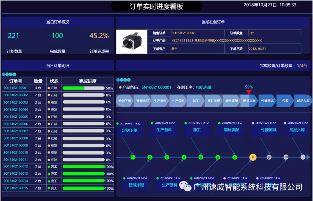 工廠可通過MES目視化監(jiān)控功能實(shí)現(xiàn)海量訂單數(shù)據(jù)的統(tǒng)計(jì)分析,訂單生產(chǎn)進(jìn)度的實(shí)時(shí)查詢。針對(duì)每個(gè)客戶訂單,根據(jù)工藝路線,實(shí)時(shí)將每個(gè)工序的完成狀況顯示出來;同時(shí)自動(dòng)跟蹤每個(gè)生產(chǎn)工令的開工、生產(chǎn)異常停機(jī)、不良種類和數(shù)量、停機(jī)情況等。方便生產(chǎn)透明化管理,追溯到每個(gè)人員、設(shè)備和物料,并能對(duì)逾期訂單提前預(yù)警,實(shí)時(shí)掌控客戶訂單按時(shí)交期和生產(chǎn)狀況。