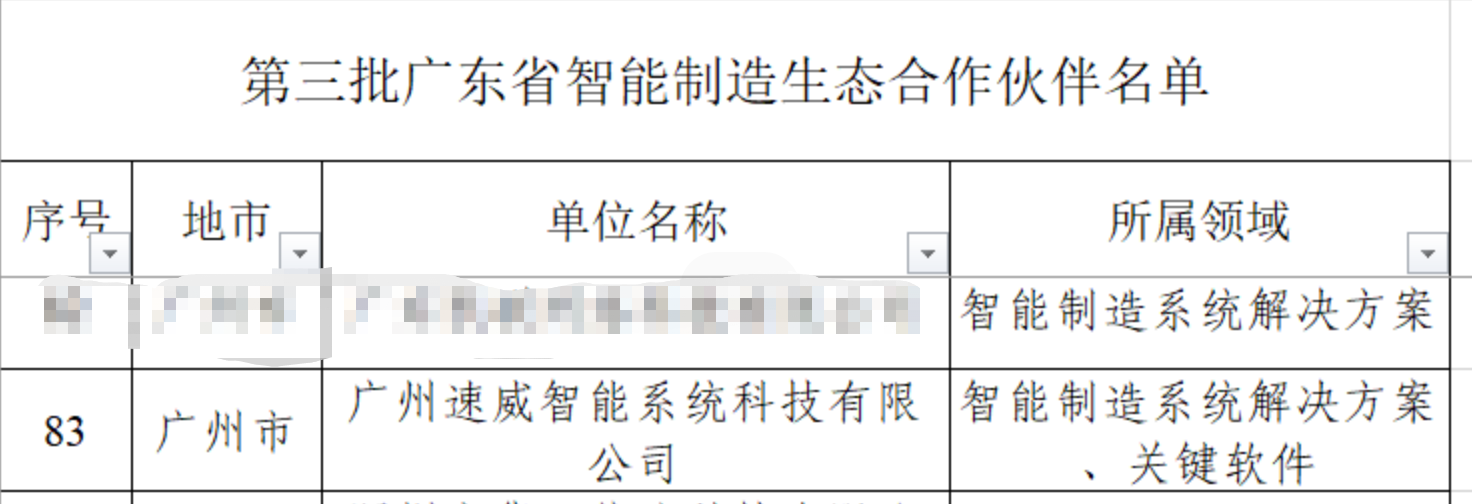 2023年8月22日,廣東省工業(yè)和信息化廳對第三批廣東省智能制造生態(tài)合作伙伴名單進(jìn)行了公示,速威有幸入選到這份大名單中,成為全省15位智能制造系統(tǒng)解決方案的廠商之一!