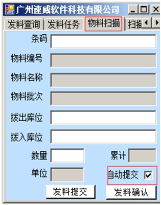 b、用PDA掃描物料的條碼,系統(tǒng)自動找到該發(fā)料任務(wù)并提交。