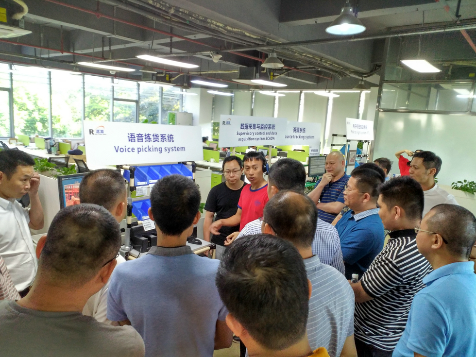 郭總以及速威同事給商會(huì)代表團(tuán)講解速威語音揀貨系統(tǒng)、電子標(biāo)簽揀貨系統(tǒng)、數(shù)據(jù)采集與監(jiān)控系統(tǒng)SCADA。讓商會(huì)代表團(tuán)深入了解速威產(chǎn)品。