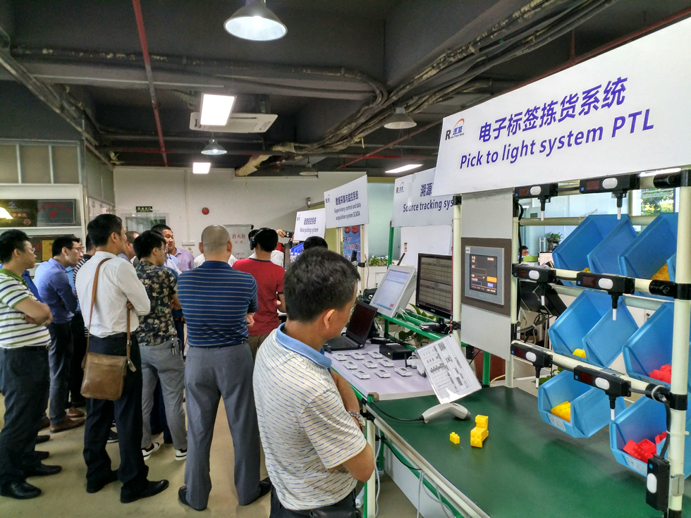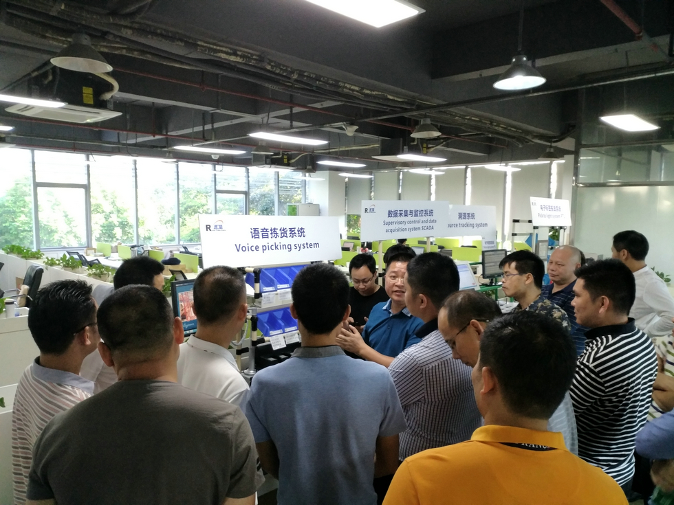 商會(huì)代表團(tuán)在認(rèn)真了解速威語音揀貨系統(tǒng)以及電子標(biāo)簽揀貨系統(tǒng)