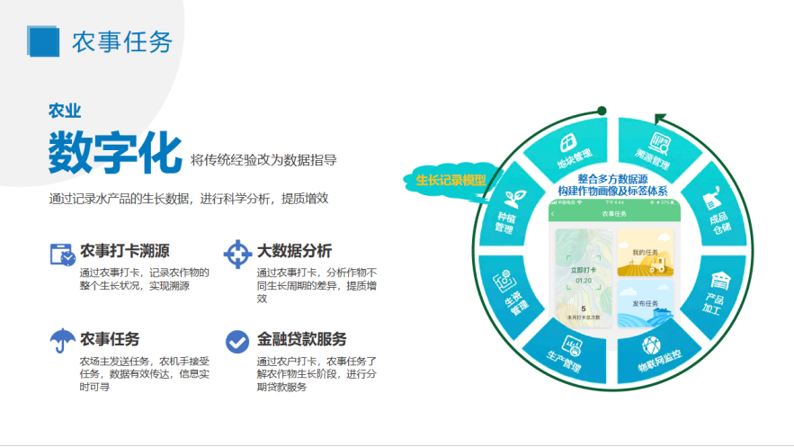 可對農(nóng)場全生產(chǎn)流程的每個(gè)環(huán)節(jié)進(jìn)行信息化、智能化管理,包括規(guī)劃生產(chǎn)流程、自動(dòng)化任務(wù)管理、即時(shí)溝通交流、巡園監(jiān)督管理、病蟲害圖像識別、農(nóng)資投入品管理等。