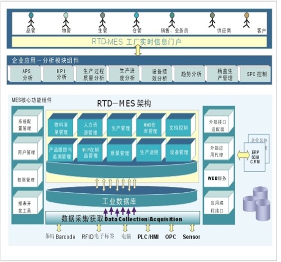《MES制造執(zhí)行系統(tǒng)》結(jié)合了制造執(zhí)行理論、精益生產(chǎn)、6 Sigma、看板管理等先進(jìn)管理思想,對(duì)從原材料上線到成品入庫(kù)的生產(chǎn)過(guò)程進(jìn)行實(shí)時(shí)數(shù)據(jù)采集、控制和監(jiān)控。RTD-MES系統(tǒng)是從生產(chǎn)計(jì)劃的下達(dá),到成品的出貨的整個(gè)過(guò)程中進(jìn)行實(shí)時(shí)數(shù)據(jù)采集、監(jiān)控、管理的軟件系統(tǒng)。以RTD-MES軟件為核心,將數(shù)據(jù)采集技術(shù)、移動(dòng)計(jì)算技術(shù)、自動(dòng)化控制技術(shù)、數(shù)據(jù)庫(kù)技術(shù);敏捷制造、精益生產(chǎn)、工業(yè)系統(tǒng)工程理論有機(jī)結(jié)合。填補(bǔ)了從ERP為代表的計(jì)劃層到以HMI為代表的控制層之間的溝壑,實(shí)現(xiàn)生產(chǎn)現(xiàn)場(chǎng)透明化管理。