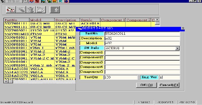 該功能主要是維護(hù)產(chǎn)品的型號資料,包括產(chǎn)品型號、規(guī)格、組成該產(chǎn)品的主要零配件、工程版本等,以及該成品的條形碼定義規(guī)則(在基本資料管理進(jìn)行設(shè)置)。例:新產(chǎn)品新增界面: