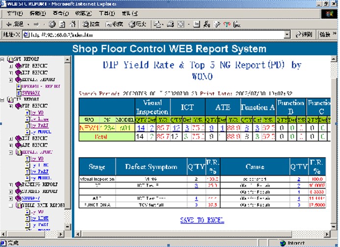 該功能主要是查詢生產(chǎn)線上在制品的情況,根據(jù)使用者輸入的查詢條件(如線別、工單、品號等),系統(tǒng)將結(jié)合掃描數(shù)據(jù)進(jìn)行分析,實時得出各條生產(chǎn)線、每張工單的各工序的生產(chǎn)情況(良品數(shù)量、不良數(shù)量、成品率等),便于管理者查詢。同時可以方面地進(jìn)行打印或轉(zhuǎn)成Excel、Word等電子文檔。