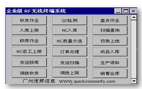 該系統(tǒng)包括:收貨作業(yè)、入庫上架、移庫作業(yè)、NC返工上架、發(fā)運移庫、調(diào)撥收貨、QC檢測、NC入庫、NC質(zhì)量分揀、訂單處理、發(fā)運掃描、調(diào)撥上架、盤點作業(yè)、掃描查詢、切換上線、成品入庫、生產(chǎn)領(lǐng)料、銷售出庫等功能模塊。