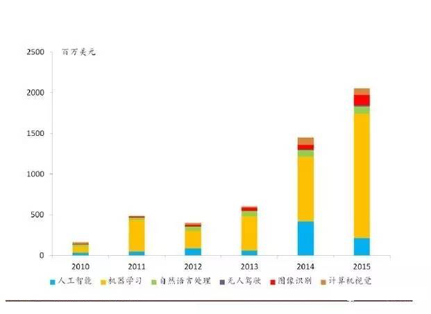 首先,人工智能產(chǎn)業(yè)的投資逐年增加。資本是最靈敏的風(fēng)向標(biāo)。從已經(jīng)披露的人工智能領(lǐng)域投資來(lái)看,2011 年到2016 年的五年間,無(wú)論是總體融資額還是交易次數(shù)都在逐年上升,人工智能領(lǐng)域的創(chuàng)投金額5年間增長(zhǎng)了12 倍。