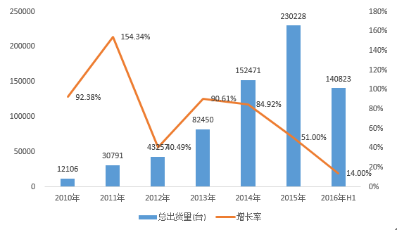 圖表:2008-2015年全球3D打印設(shè)備出貨量增長(zhǎng)情況