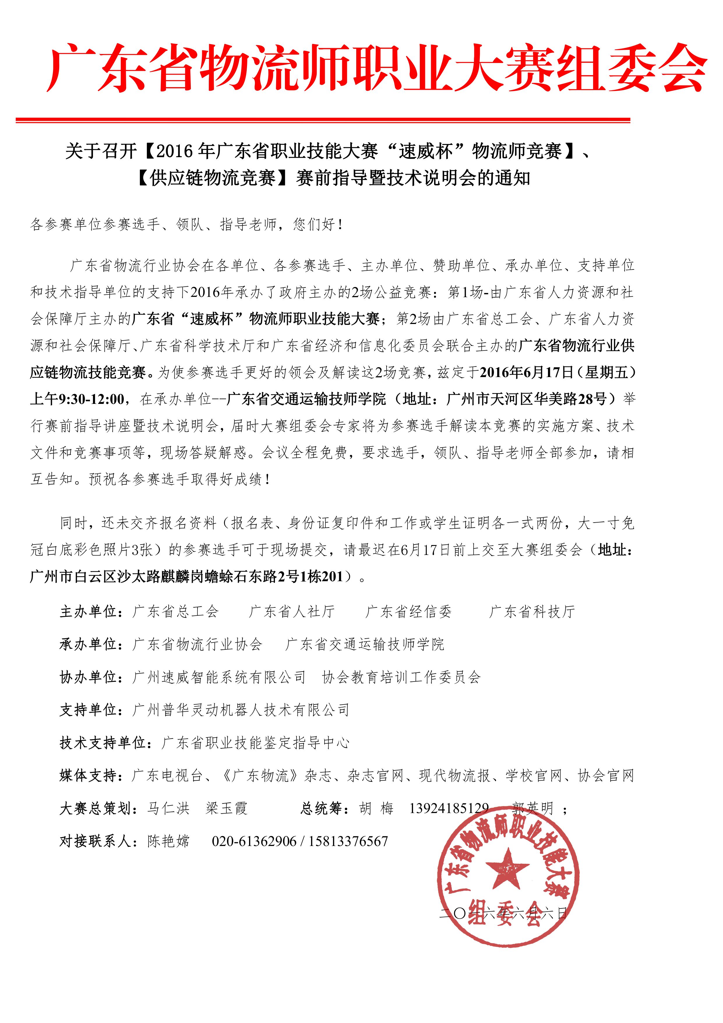 您 們好!【2016年廣東省職業(yè)技能大賽“速威杯”物流師競賽】和【供應(yīng)鏈物流競賽】賽前指導暨技術(shù)說明會茲定于2016年6月17日(星期五)上午 9:30-12:00,在承辦單位--廣東省交通運輸技師學院(地址:廣州市天河區(qū)華美路28號)舉行,要求選手,領(lǐng)隊、指導老師全部參加,請相互告知!屆時會解讀文件和講解注意事項。 預(yù)祝各參賽選手取得好成績!聯(lián)系人及聯(lián)系方式:陳艷嫦 15813376567